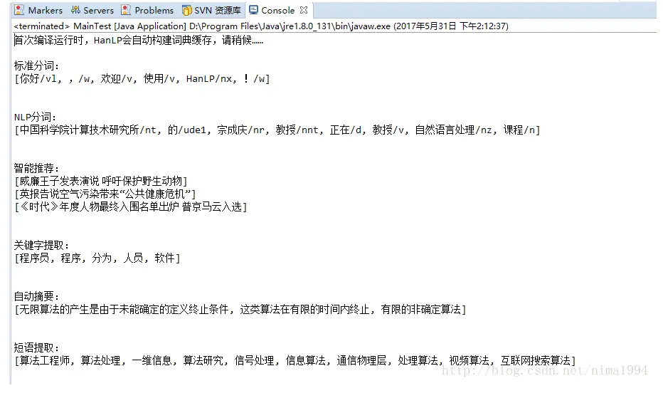 public class MainTest { public static void main(String[] args) { System.out.println("首次编译运行时,HanLP会自动构建词典缓存,请稍候……\n"); //第一次运行会有文件找不到的错误但不影响运行,缓存完成后就不会再有了 System.out.println("标准分词:"); System.out.println(HanLP.segment("你好,欢迎使用HanLP!")); System.out.println("\n");