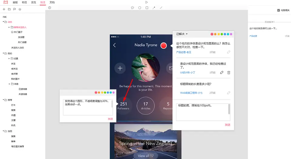 - 还支持百分比标注;不仅可以选择单个图层,还可以连续选择多个图层,并智能标注需要的度量。设计师再也不用手动标注了,开发人员需要什么信息自己就能查看,开发人员也省心了。
