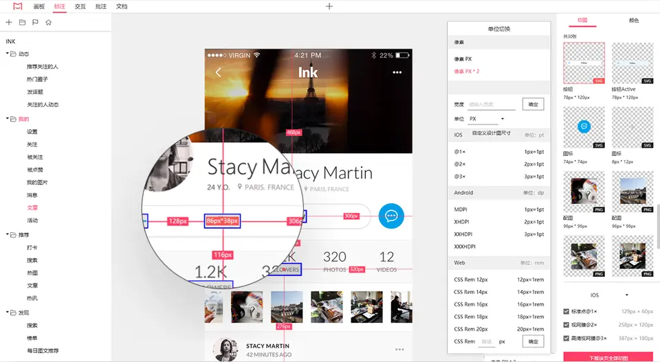 - 智能标注,让设计师解放双手,再也不需要手动做;可以完整而清晰地将PS、Sketch设计图中每个元素的尺寸、位置、颜色、间距、字号等样式信息自动同步到摹客iDoc,开发师可以随时查看。