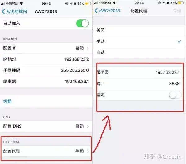 手机设置代理 IP。打开手机 无线网络连接 ,选择已经连接的网络连接,点击一个小圆圈叹号进入可以看到下图(安卓也类似),选择 配置代理 ,进入后把刚刚的 IP 地址 输入进去, 端口 就是 fiddler 中设置的 8888。