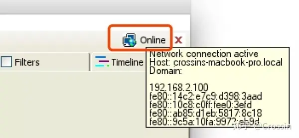打开软件,鼠标放在右上角的 Online 上可以看到 本机的 IP 。或者也可以通过命令行中的 ipconfig 命令(Mac/Linux 是 ifconfig )查看。(截图仅为演示,以你自己的 IP 为准)