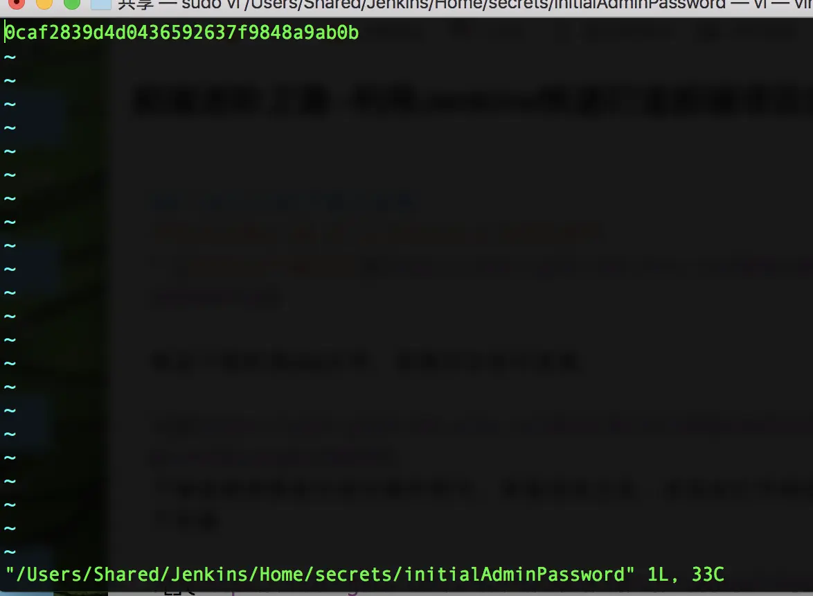 /Users/Shared/Jenkins/Home/secrets/initialAdminPassword 在mac终端输入 sudo vi /Users/Shared/Jenkins/Home/secrets/initialAdminPassword 就能看到