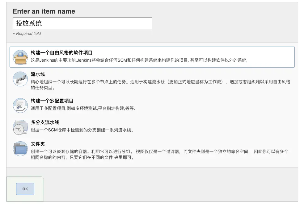 点击首页的New 任务或者create new jobs,进入创建页面,输入项目名字,选择第一个构建一个自由风格的软件项目,