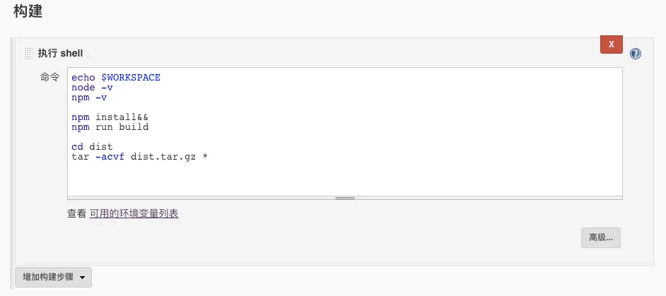 选择 执行shell 在Command窗口中填写你平常打包使用的命令,因为打包完成后要上传到服务器,所以添加了压缩文件的命令