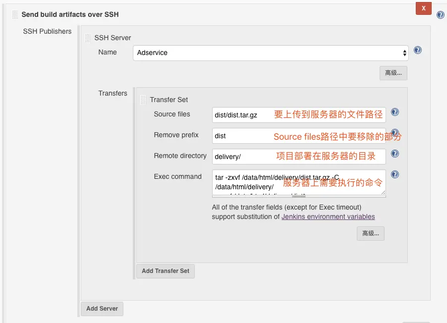让我们回到配置页面,在构建后操作下选择Send build artifacts over SSH,添加如下配置,