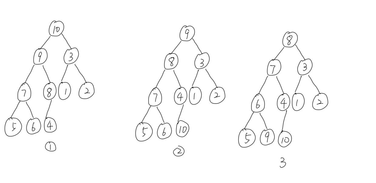 数组 [3,5,2,6,4,1,10,7,9,8] 构建完后就是图中 1 的堆,然后把 4 和 10 对调,再调整堆,得到图中 2 的堆,把 6 和 9 对调,然后调整堆,以此类推: