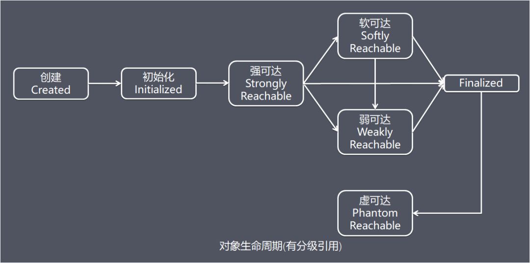 JDK1.2引入java.lang.ref程序包之后,对象的生命周期多了3个阶段,软可达,弱可达,虚可达,这些状态仅适用于符合垃圾回收条件的对象,这些对象处于非强引用阶段,而且需要基于java.lang.ref包中的相关的引用对象类来指示标明。