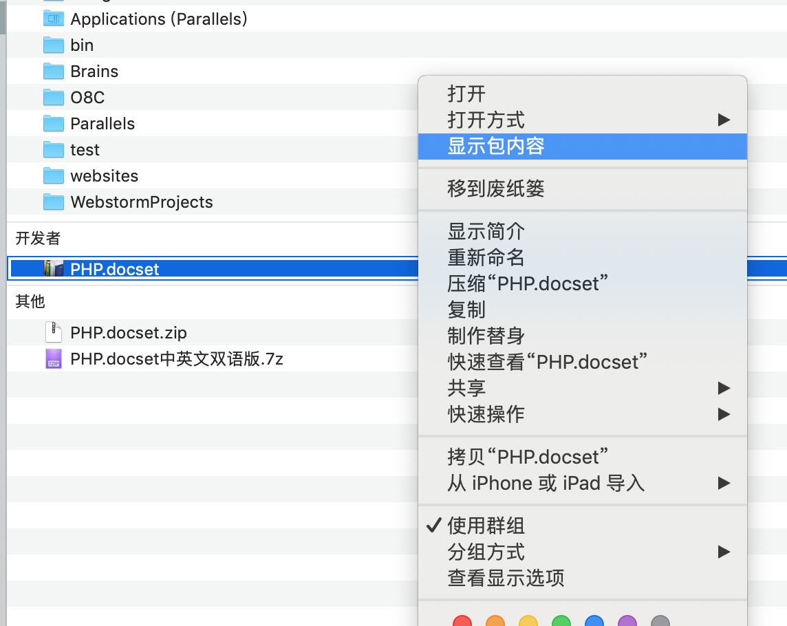 docset文件本质上就是一个文件夹,选中下载好的英文PHP.docset,右键显示包内容,打开文件夹