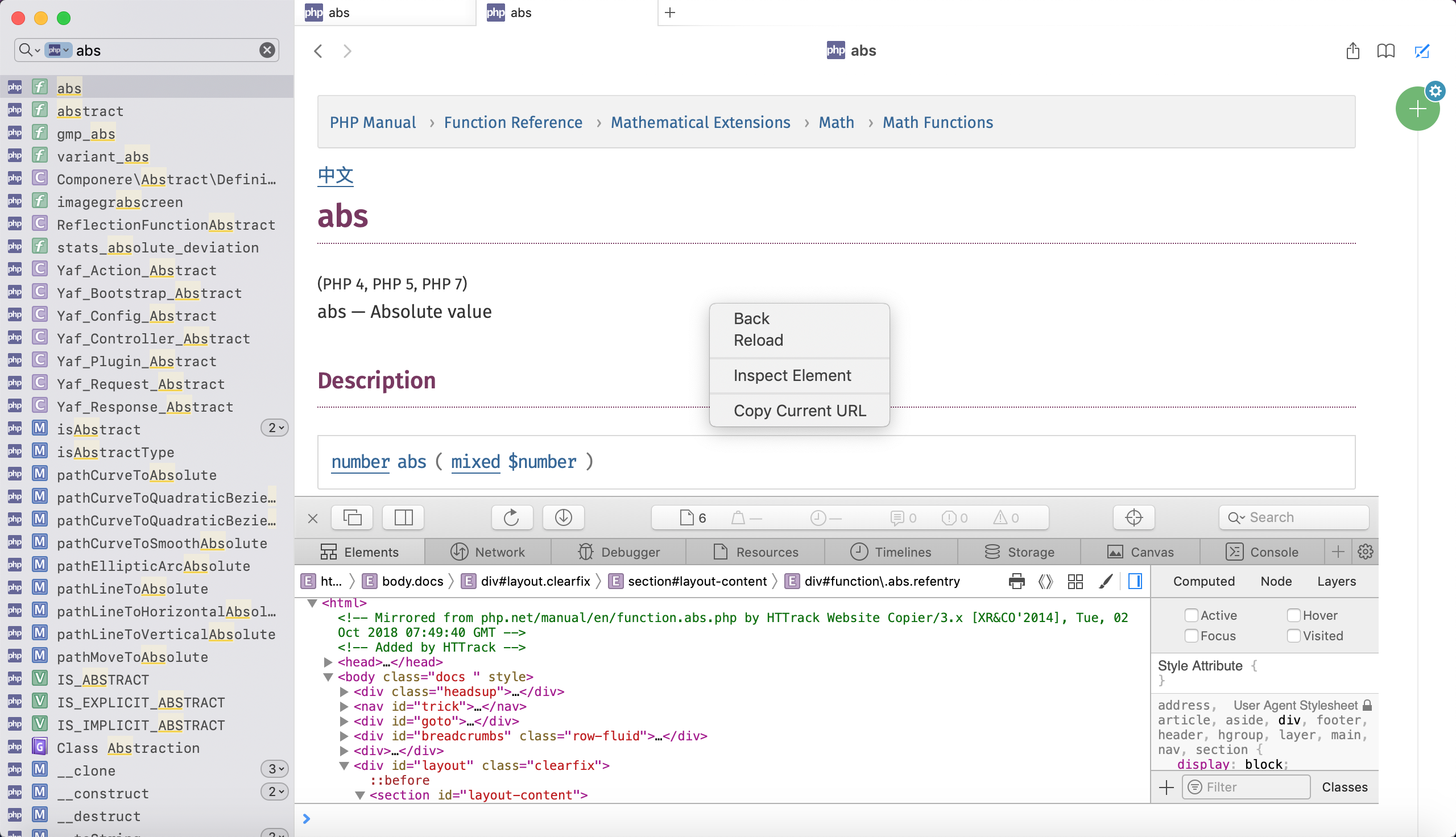目录的层次还真够深的,dash本质上说就是一个离线的api文档浏览器,内部就是一个safari浏览器,文档本质上就是html,下图是一个php的函数abs的页面,右键可以 inspect element(审查元素),