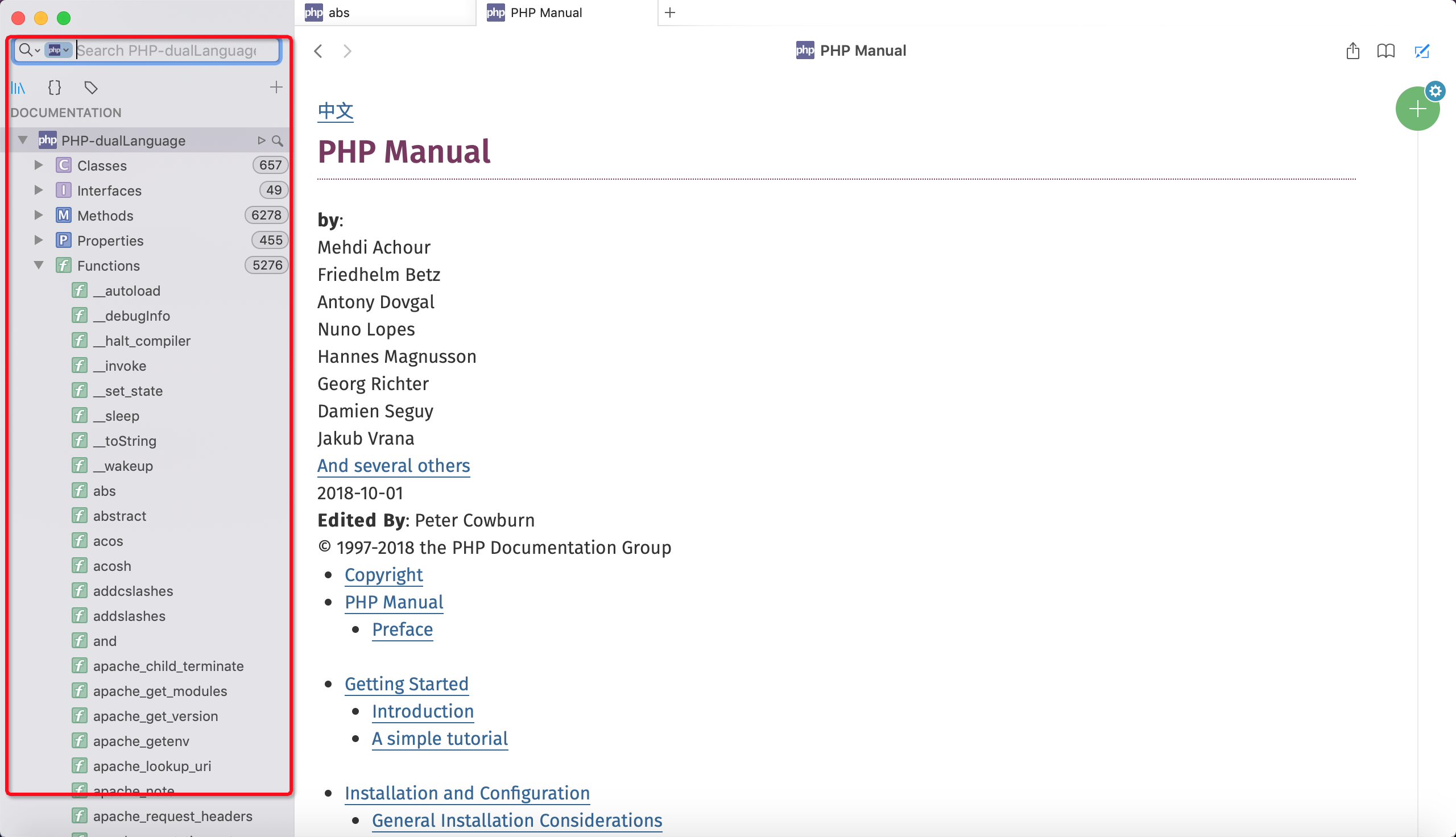 经历了一番调试、再调试的折腾后,也花了很长的时间,终于把中文文档下载下来了。又遇到了新的问题,中文文档里面的链接很多都是指向php的,离线之后的是html文件,不匹配,还有样式的链接还是指向线上的,于是又花了一番功夫对中文文档做了一些正则的匹配替换,改写离线的样式文件,最后对中英文的文档都加上了相互的链接,制作成了双语版的php dash文档。