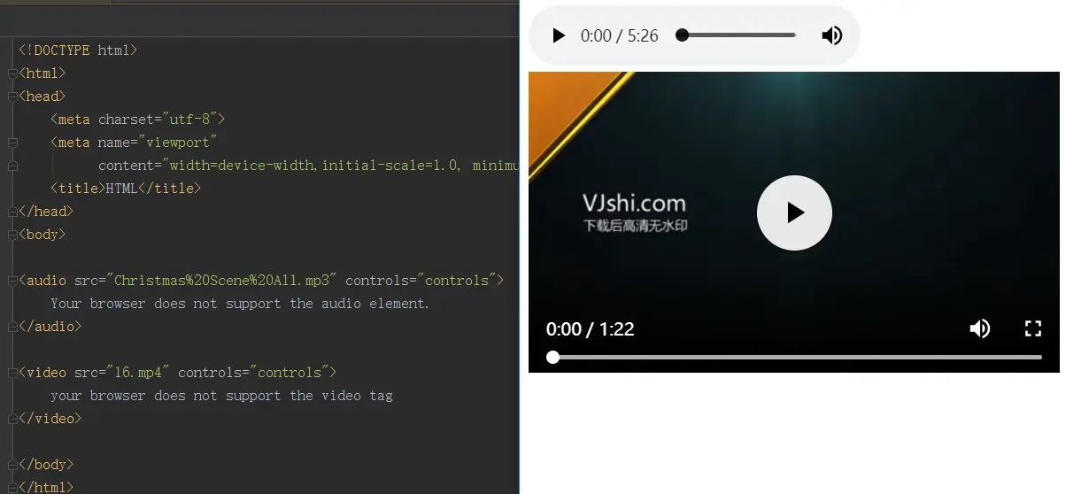 定义:这两个标签分别用于在HTML或者XHTML文档中嵌入音频和视频内容。如下图所示: