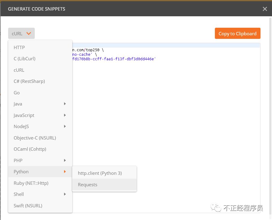 比如,我们这里选择 Python Requests,就可以得到如下代码: