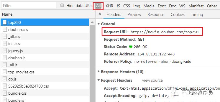 3、请求流的筛选:XHR 是 XMLHttpRequest 的意思,大多数情况下只要点击 XHR 就行了,但是若此时发现没有想要的请求数据,那么就要点击 All 展示所有请求流。