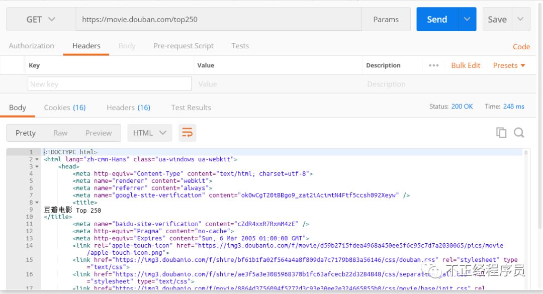 import requestsurl = "https://movie.douban.com/top250"headers = { 'cache-control': "no-cache", 'postman-token': "d2e1def2-7a3c-7bcc-50d0-eb6baf18560c" }response = requests.request("GET", url, headers=headers)print(response.text)