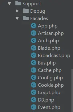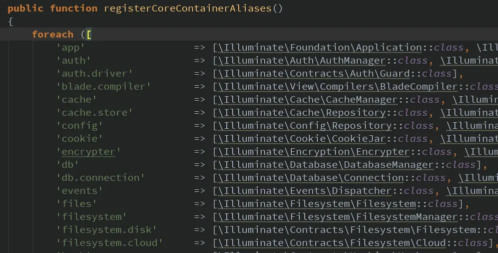 而外观模式其实就是为了将调用和框架解耦,减少系统中的相互依赖。 我们可以在Laravel的Application类中看到别名对应的实际类: