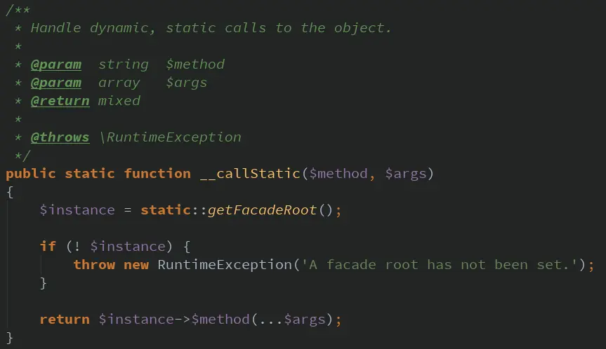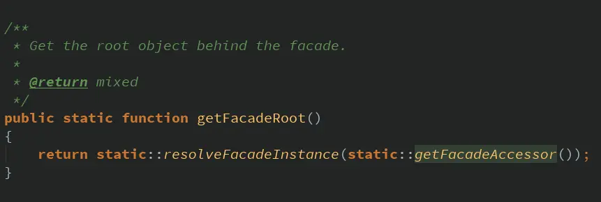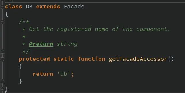 可以看到,Facade这个抽象类实现了__callStatic()静态调用方法,其中又调用了getFacadeRoot(),而getFacadeRoot()里就调用了刚才的getFacadeAccessor()获取服务提供者的别名,在DB类中即“db”。 resolveFacadeInstance()就通过Laravel的容器机制把DB的实际对象解析了出来,这样既实现了单例模式,又容易调用。