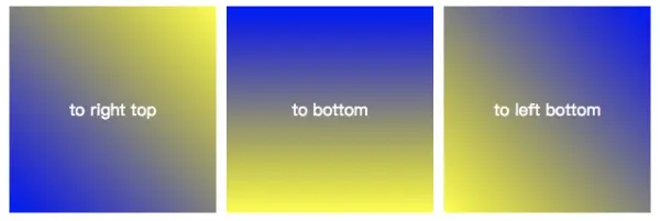 此图解释了渐变角度的计算方式- <side-or-corner>:直译成中文是“边或角”,也就是说这个值表明了渐变指向哪个边或哪个角。他的取值由一个或两个关键字组成,包括垂直关键字(top和bottom)和水平关键字(left和right),如:to left ;to left top等等。下面是用蓝色向黄色渐变的示例来表示方向值所对应的效果: