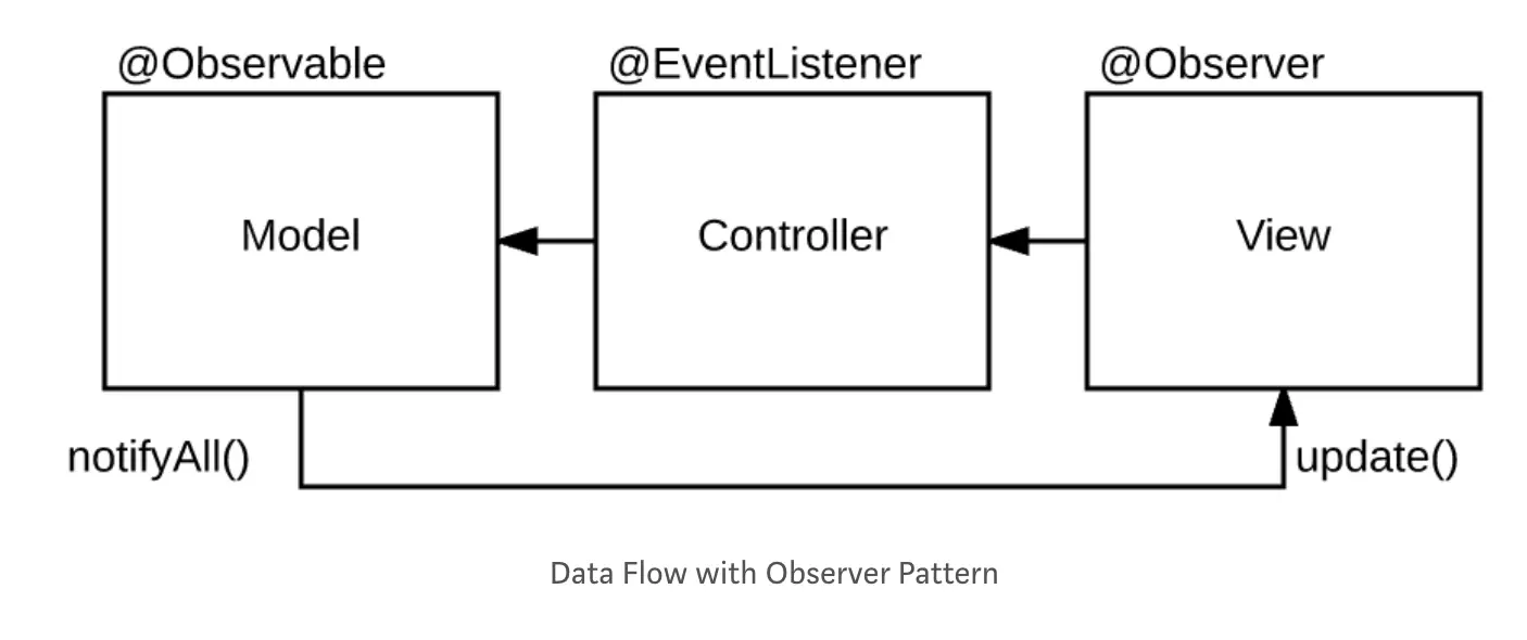 那么在观察者模式中,我们可以把model变换为可观察的对象,把view变为观察者。当被观察者发生改变的时候,它就通知观察者它此时的状态,随后观察者根据此状态进行自我的更新。这使得数据流变成了单向数据流。在这里,controller不在更新view,而是view根据model进行自我更新。