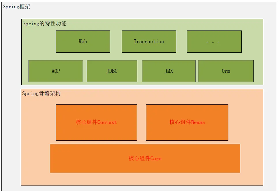 从图中可以看出,Spring框架中的核心组件只有三个:Context ,Core和Beans,它们构建起了整个Spring 的骨骼架构。没有它们就不可能有AOP,Web等上层的特性功能。下面也将主要从这三个组件入手分析 Spring