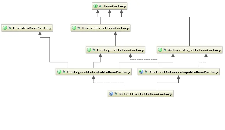 这个方法实现了AbstractApplicationContext的抽象方法refreshBeanFactory ,这段代码清楚的说明了BeanFactory的创建过程。注意BeanFactory类型的变化,前面介绍了它有很多子类,在什么情况下使用不同的子类这非常关键。 BeanFactory的原始对象是DefaultListableBeanFactory。这非常关键,因为它涉及到后面对这个对象的多种操作,下面看一下这个类的继承层次类图: