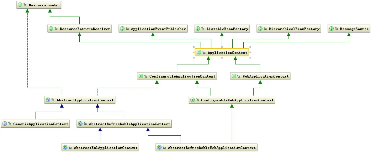 从上图中可以看出ApplicationContext继承了BeanFactory ,这也说明了Spring容器中运行的主体对象是Bean,另外,ApplicationContext 继承了ResourceLoader接口,这使得ApplicationContext可以访问到任何外部资源,这将在 Core中详细说明。