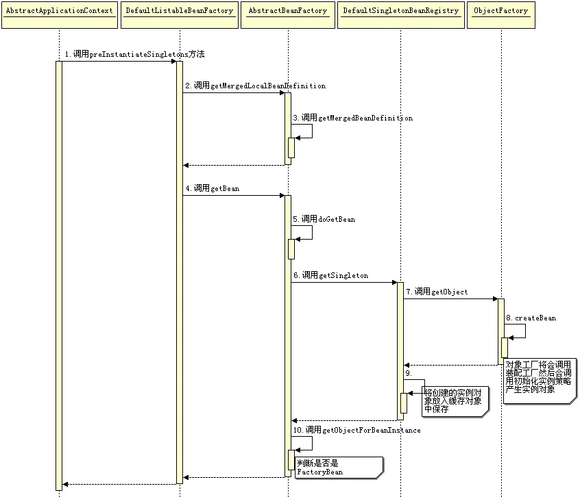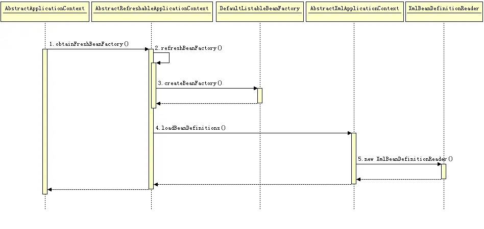 public void refresh() throws BeansException, IllegalStateException { synchronized(startupShutdownMonitor) { //Prepare this context for refreshing prepareRefresh(); //tell the subclass to refresh the internal bean factory ConfigurableListableBeanFactory beanFactory = obtainFreshBeanFactory(); //Prepare the bean factory for use in this context prepareBeanFactory(beanFactory); try{ //Allows post-processing of the bean factory in context subclass postProcessBeanFactory(beanFactory); //Invoke factory processors registered as beans in the context invokeBeanFactoryPostProcessors(beanFactory); //Register bean processors that intercept bean creation registerBeanPostProcessors(beanFactory); //Initialize message source for this context initMessageSource(); //Initialize event multicaster for this context initApplicationEventMulticaster(); //Initialize other special beans in specific context subclasses onRefresh(); //Check for listener beans and register them registerListeners(); //Instantiate all remaining(non-lazy-init) singletons finishBeanFactoryInitialization(beanFactory); //Last step: public corresponding event finishRefresh(); }catch(BeansException ex) { destroyBeans(); cancelRefresh(ex); throw ex; } } } |
