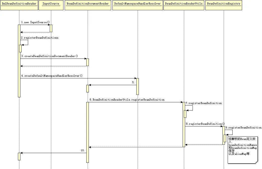 从这个可以发现除了BeanFactory相关的类外,还有与Bean 的register相关的类。这在refreshBeanFactory方法中有一行loadBeanDefinations (beanFactory)将找到答案,这个方法将开始加载,解析Bean的定义,也就是把用户定义的数据结构转化成 IOC中特定的数据结构。