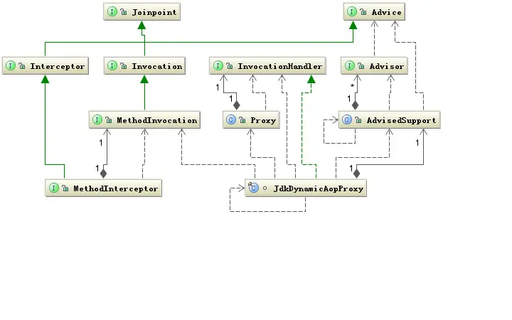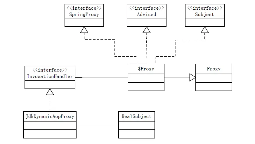 SpringAop中JDK动态代理就是利用代理模式实现的。在 Spring中除了实现被代理对象的接口外,还会有org.springframework.aop.SpringProxy和org.springframework.aop.framework.Advisted 两个接口,Spring中使用代理模式的结构图如下: