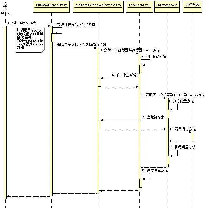 下面再看看Spring是如何调用拦截器的,下面是这个过程的时序图: