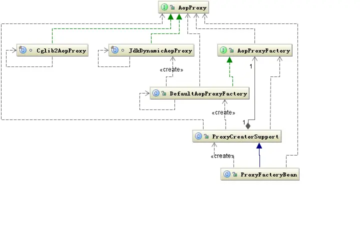 上图与标准的策略模式稍有不同,这里抽象策略是AopProxy接口,Cglib2AopProxy 和JdkDynamicAopProxy分别代表两种策略的实现方式,ProxyFactoryBean就是代表 Context角色,它根据条件选择使用JDK代理还是CGLIB代理。而另外三个类主要是负责创建具体策略对象, ProxyFactoryBean是通过依赖方法来关联具体策略对象的,它是通过调用策略对象的getProxy(ClassLoader classLoader)来完成具体操作的。