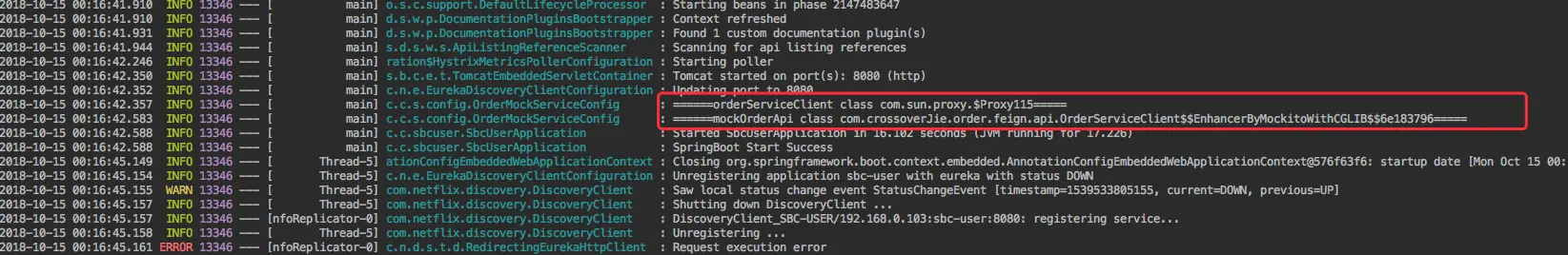 通过日志也会发现 OrderServiceClient 最后已经被 Mock 代理了,并不会去调用真正的方法。