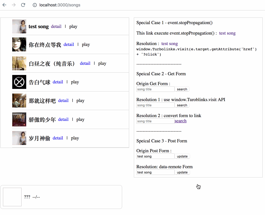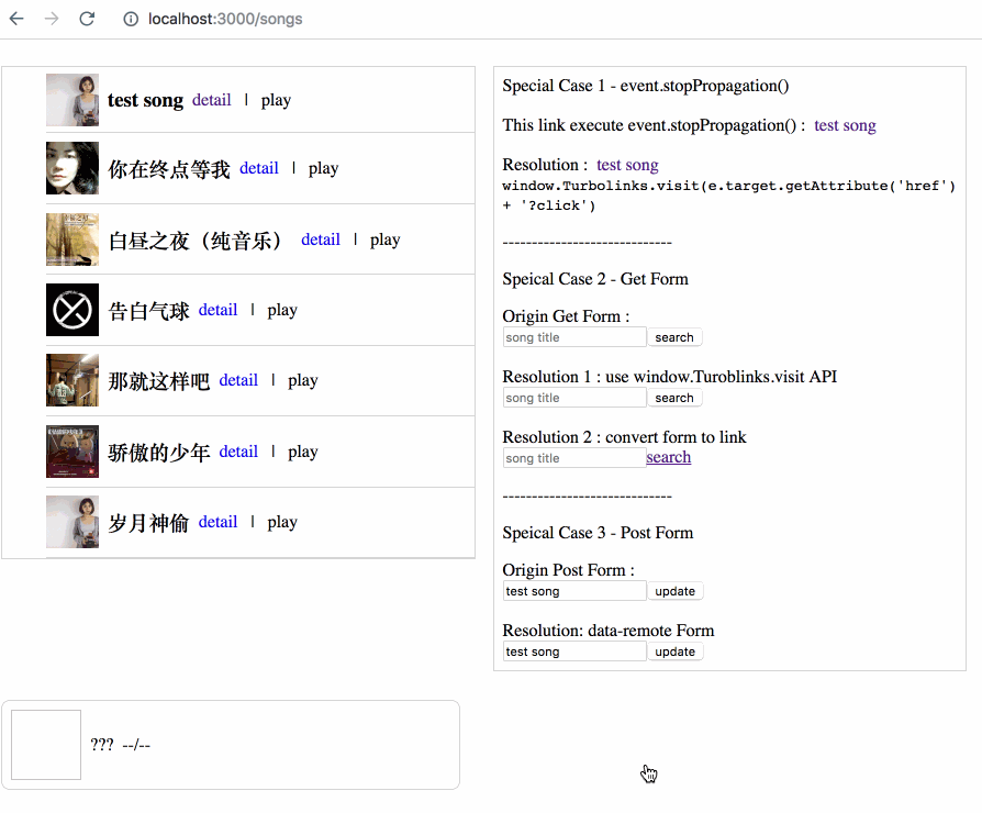 实现极其简单,因为 Turbolinks 可以帮助我们在切换页面时保持内存状态,因此我们只需要把 audio element 和当前状态保存到 window 全局对象中即可,跳转到新页面后再读取出来,that's all。
