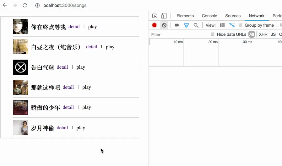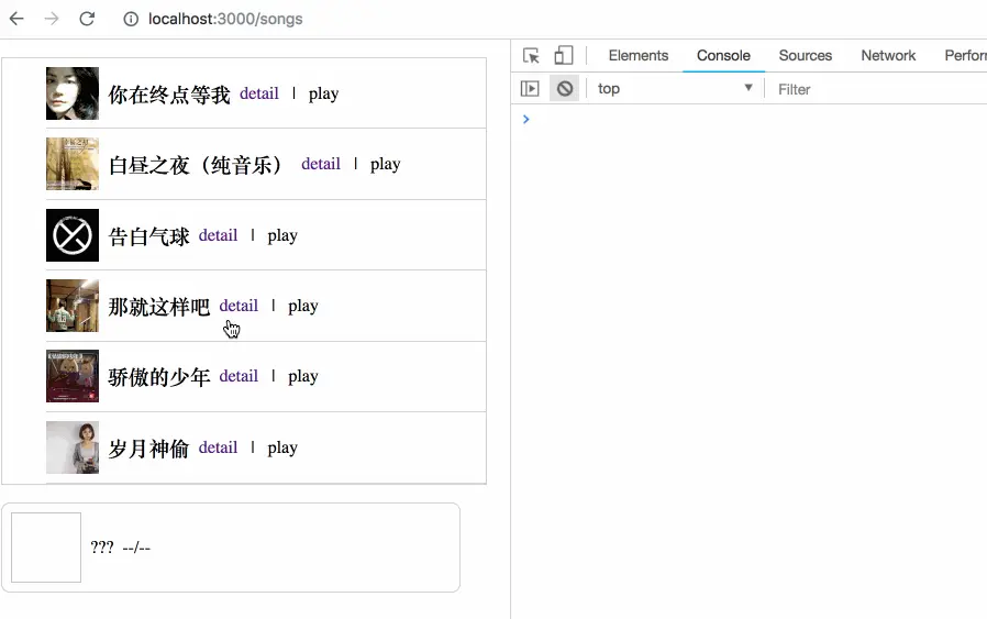 如最开头的截图动画所示,这个网站有两个页面,一个页面是歌曲列表,一个页面是单首歌曲的详情页,在这两个页面的底部都有一个音乐播放器。点击任何一首歌曲的 play 按钮,将播放这首歌,且页面间切换时,我期望播放器不会出现任何间断。