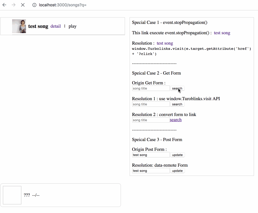 event.preventDefault()阻止默认提交,然后调用Turbolinks.visit(url)API 手动发送 ajax 请求。 - 将 GET 类型的 Form 转换成