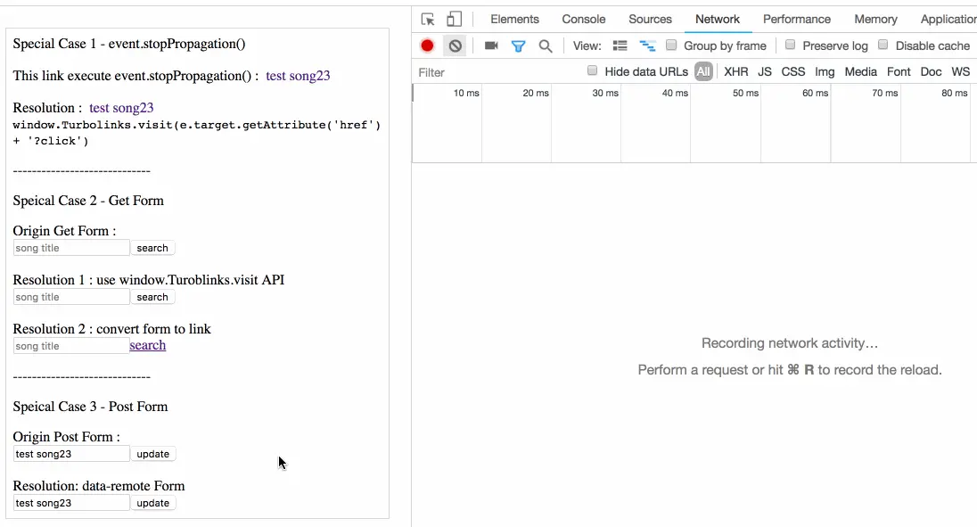 先来看第一种情况,在调用 event.stopPropagation() 阻止了事件冒泡后,请求将变回默认的 html 请求,我们可以调用 event.preventDefault() 阻止默认操作,并调用 Turbolinks.visit(url) API 手动发出 ajax 请求。