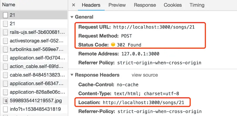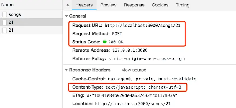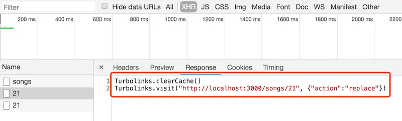 如果我们的 ajax 请求得到的也是这种响应,那么跳转无法自动实现。所幸的是,Rails 很智能,它如果检测到 POST 请求是 ajax 发起的,且 Turbolinks 启用,在 redirect_to @song 中,它将不再返回 302,而是返回一段 JavaScript 代码: