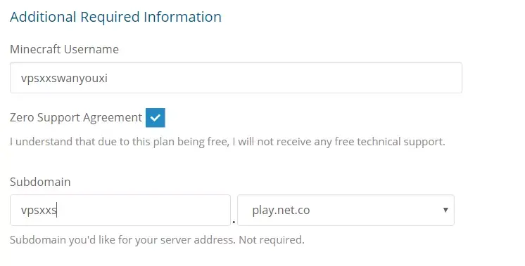 接着给自己的游戏服务器起个名字,然后同意注册协议,再输入一个子域名,点击右侧的Continue进入下一步: