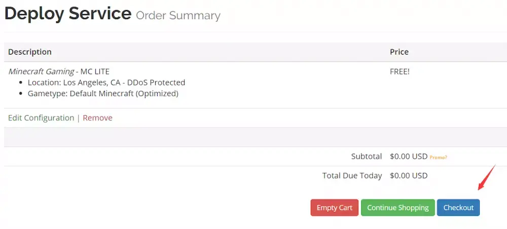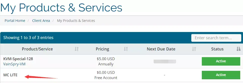 然后直接结账就可以了,在首页导航选择Services的下拉菜单My Services就可以看到刚刚领取的Minecraft主机主机了: