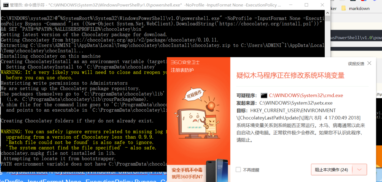 @"%SystemRoot%\System32\WindowsPowerShell\v1.0\powershell.exe" -NoProfile -InputFormat None -ExecutionPolicy Bypass -Command "iex ((New-Object System.Net.WebClient).DownloadString('https://chocolatey.org/install.ps1'))" && SET "PATH=%PATH%;%ALLUSERSPROFILE%\chocolatey\bin"