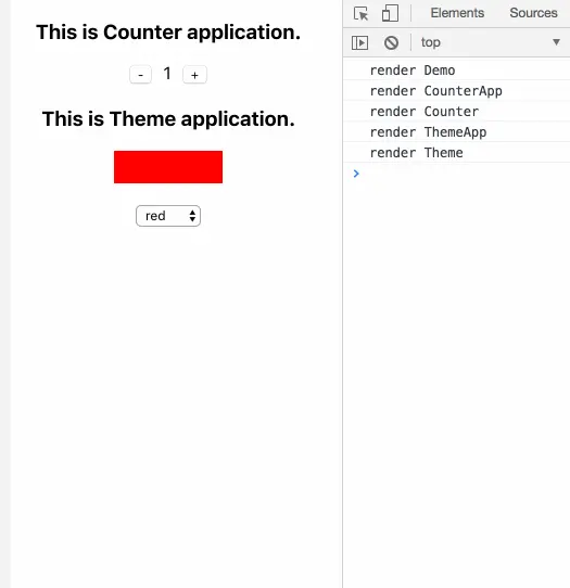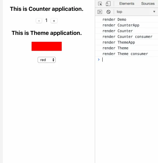 下面我们再来看看实际运行效果。从下图中我们可以清楚地看到,CounterApp中的number和ThemeApp中的color都能正常地响应我们的操作,说明New Context API确实达到了我们预期的效果。除此之外,不妨再仔细观察console控制台的输出。当我们更改数字或颜色时我们会发现,由于CounterApp和ThemeApp是PureComponent,且都没有使用count和theme,所以它们并不会触发render,甚至Counter和Theme也没有重新render。但是,这却并不影响我们Consumer中的正常渲染。所以啊,上文提到Old Context API的子孙组件可能不更新的这个遗留问题算是真的解决了~~~