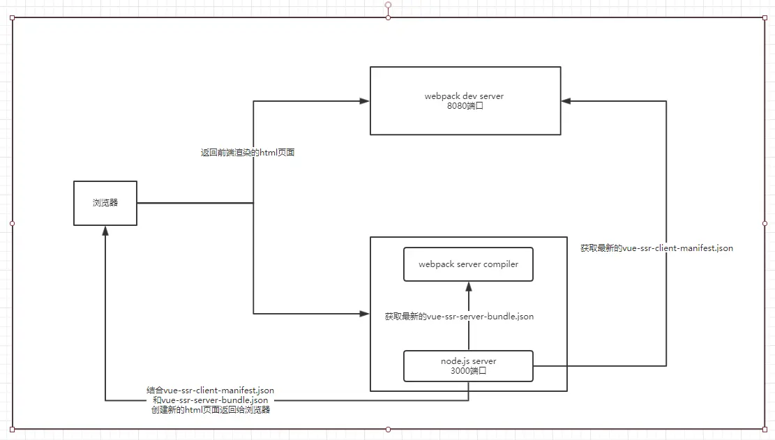 - 起一个webpack compiler 编译webpack配置文件,监听文件修改,实时编译获取最新的 vue-ssr-server-bundle.json
