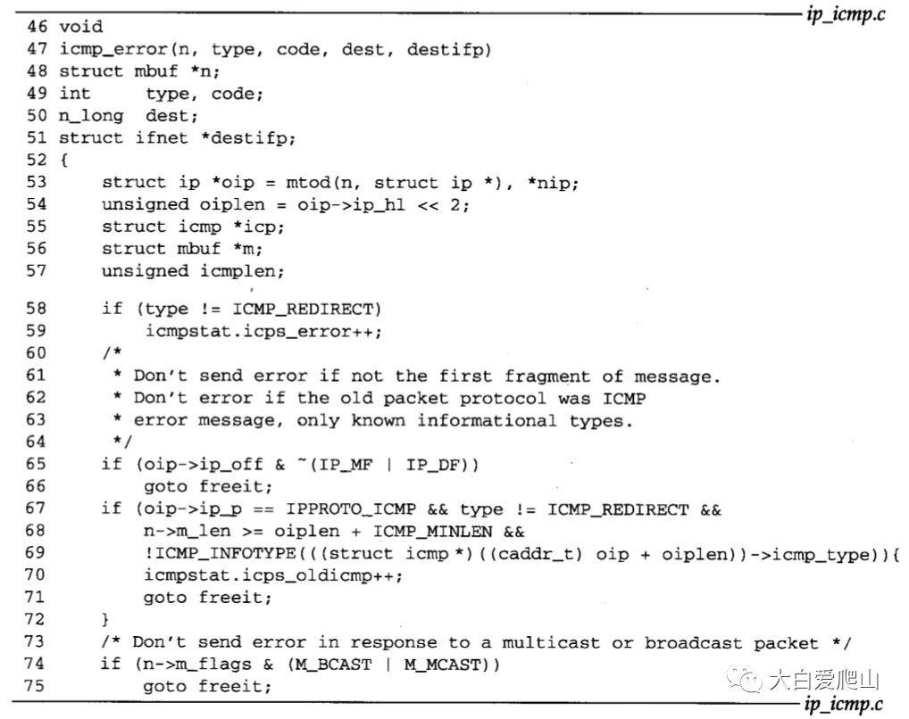 46~57 参数:n,指向包含无效数据报缓存链的指针;type和code,ICMP差错类型和代码;dest,ICMP重定向报文中的下一跳路由器地址;以及destifp,指向原始IP分组外出接口的指针。mtod把缓存链指针n转换成oip,oip是指向缓存中ip结构的指针。原始IP分组的字节长度保存在ioplen中。