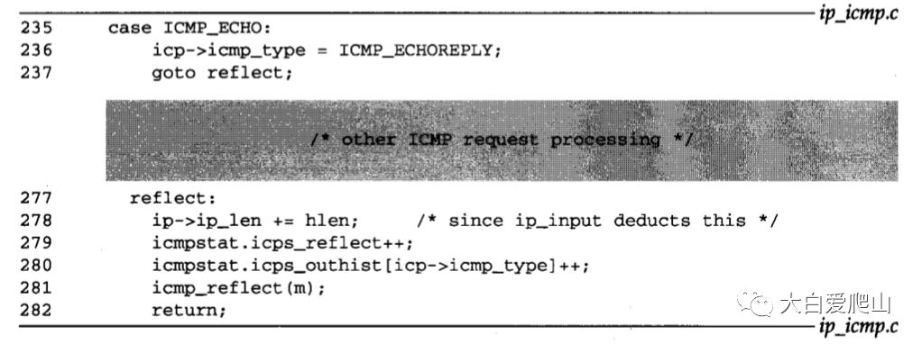 277~282 在为每个ICMP请求构造回答之后,icmp_input执行reflect处的程序。在这里,存储数据报正确的长度被恢复,在icps_reflect和icps_outhist[]中分别计算请求的数量和ICMP报文的类型。icmp_reflect把回答发回给请求方。