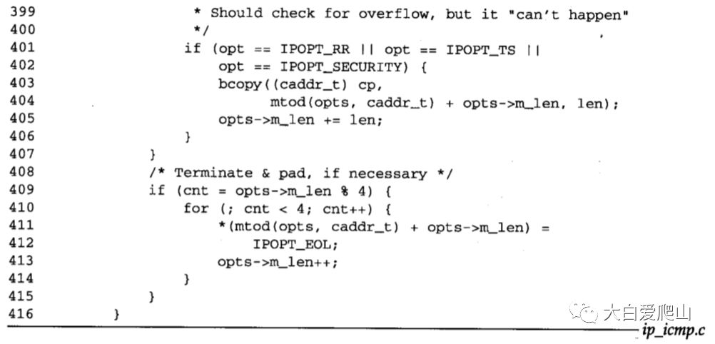 386~416 如果opts指向某个缓存,for循环搜索原始IP首部选项,在ip_srcroute返回的源路由后面加上记录路由和时间戳选项。