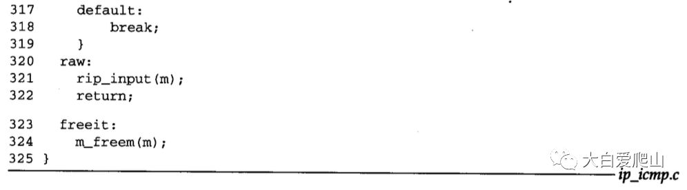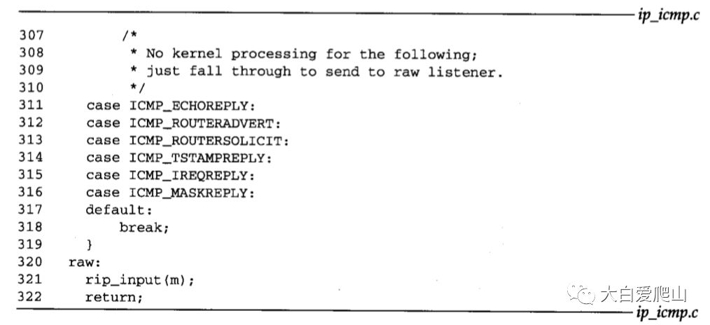 307~322 内核无需对ICMP回答报文做出任何反应,所以在switch语句后的raw语句继续执行。注意,switch语句的default情况也把控制传给在raw处的代码。