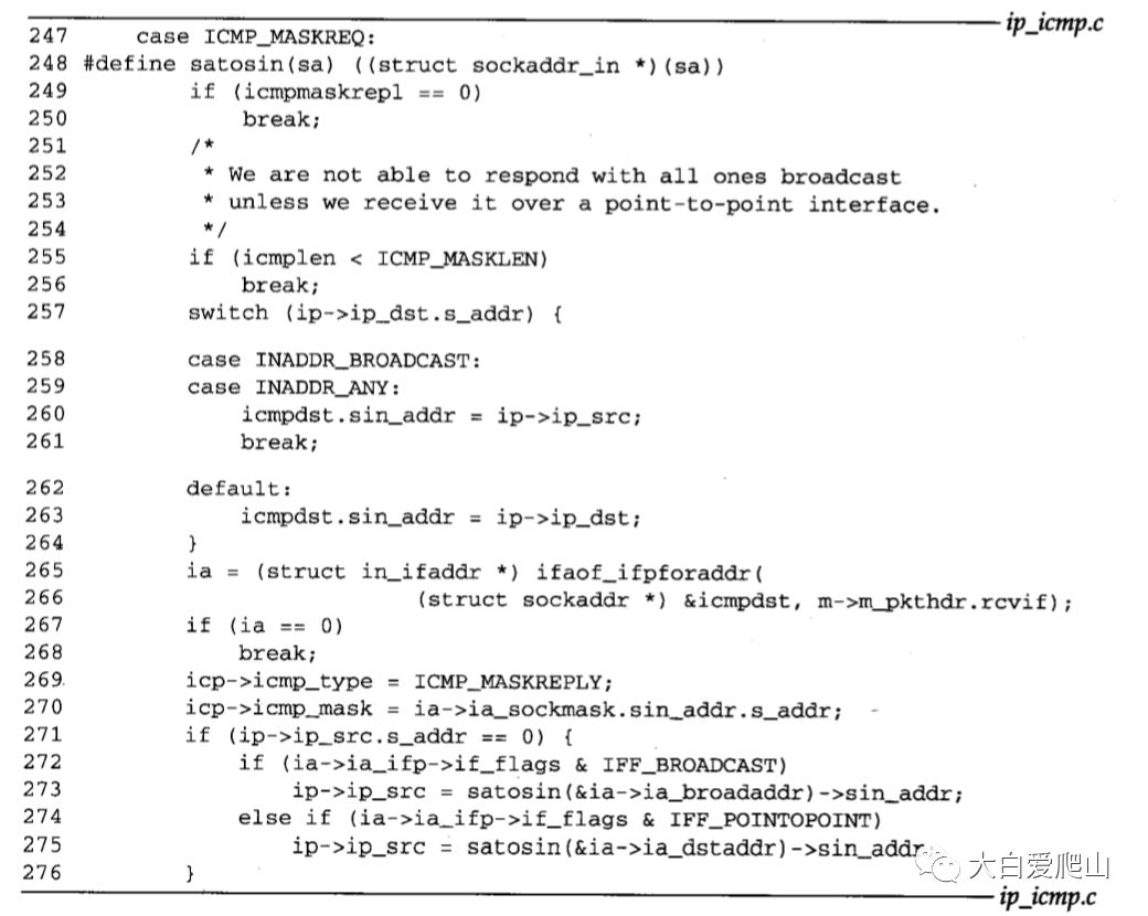 257~267 如果地址掩码请求被发到0.0.0.0或255.255.255.255,源地址被保存 icmpdst中。在这里,ifaof_ifpforaddr把icmpdst作为源站地址,在同一网络上查找in_ifaddr结构。如果源站地址是0.0.0.0或255.255.255.255,ifaof_ifpforaddr返回一个指针,该指针指向与接收接口相关的第一个IP地址。