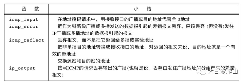 icmp_reflect把ICMP回答或差错报文发回给请求或者无效数据报的源站。注意,icmp_reflect在发送数据报之前,把它的源站地址和目的地址倒过来。与ICMP报文的源站和目的站地址有关的规则非常复杂,图30对其中几个函数的作用作了小结。