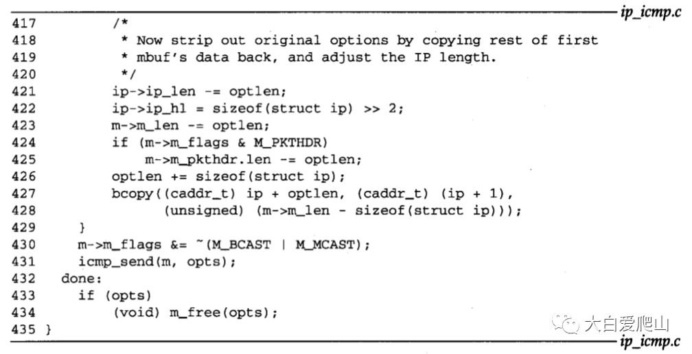 417~429 icmp_reflect把ICMP报文移到IP首部的后面,这样就从原始请求中移走了选项。如图34所示,新选项在opt所指向的mbuf里,被ip_output再次插入。