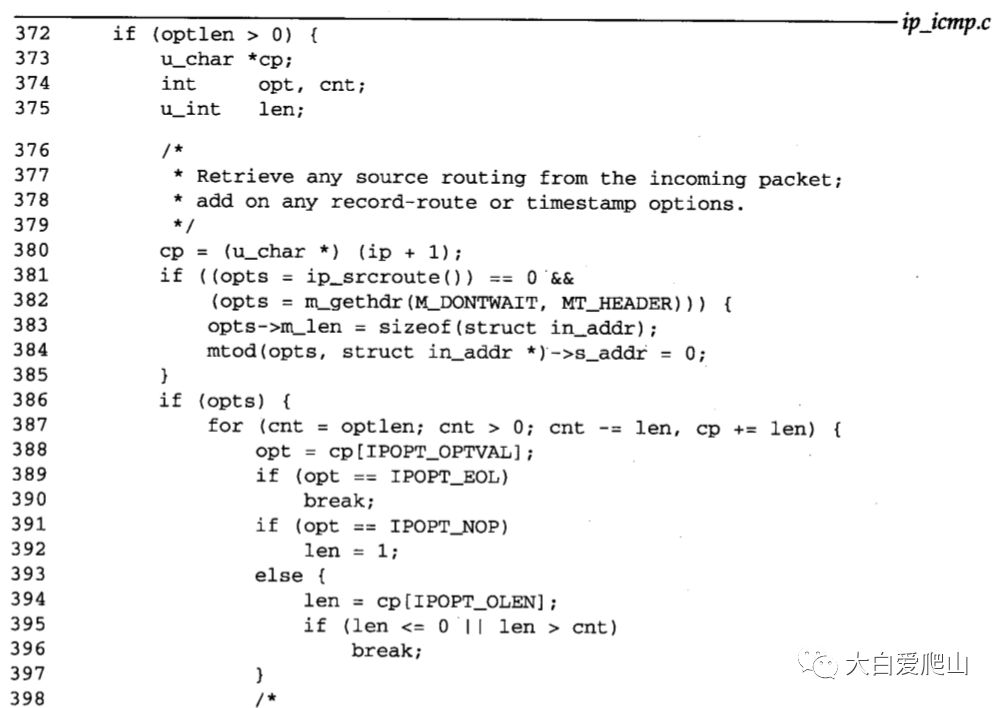 372~385 如果到达的数据报没有选项,控制被传给430行(图33)。icmp_error传给icmp_reflect的差错报文 从来没有IP选项 ,所以后面的程序只用于那些被转换成回答并直接传给icmp_reflect的ICMP请求。