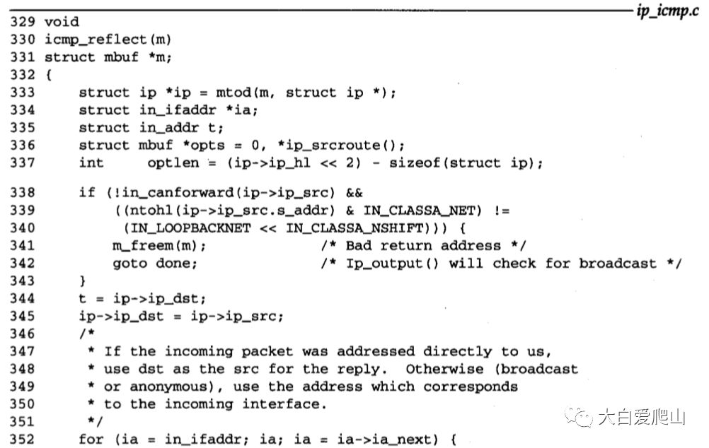 329~345 icmp_reflect一开始,就复制了ip_dst,并把请求或者差错报文的源站地址ip_src移到ip_dst。icmp_error和icmp_reflect保证:ip_src对差错报文而言是有效的目的地址。ip_output丢掉所在发往广播地址的分组。